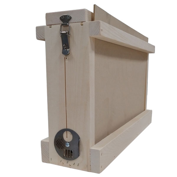 This single frame observation hive is locally handcrafted in our wood shop with Ontario White Pine. Easy to move to the classroom, farmers market or other events this box is a great temporary home for 1 frame of bees. It comes fully assembled with a handle on top and 2 lockable latches on both sides. The Plywood transport lids are removable.